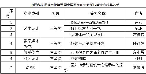 近日,第五届全国数字创意教学技能大赛获奖名单公布。在普通高等学校赛道比赛中,我校艺术学院、亚洲微电影学院报送的7部参赛作品全部获奖,其中肖波、纪阳、左曼祎3位老师荣获艺术设计类三等奖,陆筱婷、段小雪、孙赫、刘振博4位老师峰分别荣获数字媒体技术类、视觉传达类、环艺设计类、动画类三等奖。