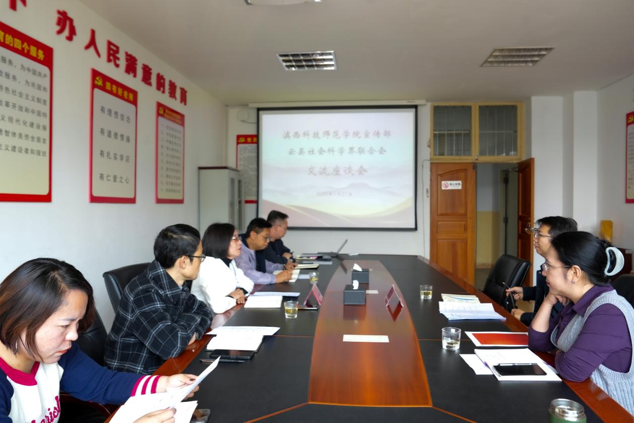 3月27日,宣传部与云县社会科学界联合会开展座谈交流会。云县社会科学界联合会主席王凤强、云县委宣传部副部长杨星勤出席会议,校党委委员、宣传部部长、马克思主义学院党总支副书记、院长杨明艳主持会议。