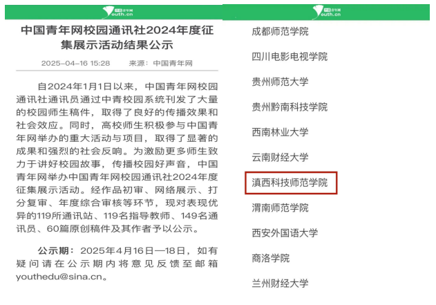 我校校园通讯站自2024年成立以来,始终以昂扬的姿态扎根校园、记录时代,用鲜活的笔触讲述滇院故事,以热忱的担当传递青年之声。在师生通讯员的共同努力下,多篇优质稿件在全国高校思政网、学习强国和云南网等多家媒体平台发布,展现了新时代滇院学子的精神风貌,更在重大活动参与中彰显了高校青年的社会责任与创新活力。
