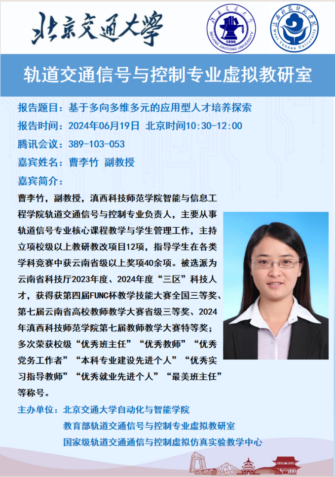 6月19日,由北京交通大学教育部轨道交通信号与控制专业虚拟教研室主办的系列活动之2024年轨道交通信号与控制专业虚拟教研室教学研讨会以线上形式开展。我校作为教育部轨道交通信号与控制专业虚拟教研室核心高校之一,轨道交通信号与控制专业负责人曹李竹作“基于多向多维多元的应用型人才培养探索”的报告。