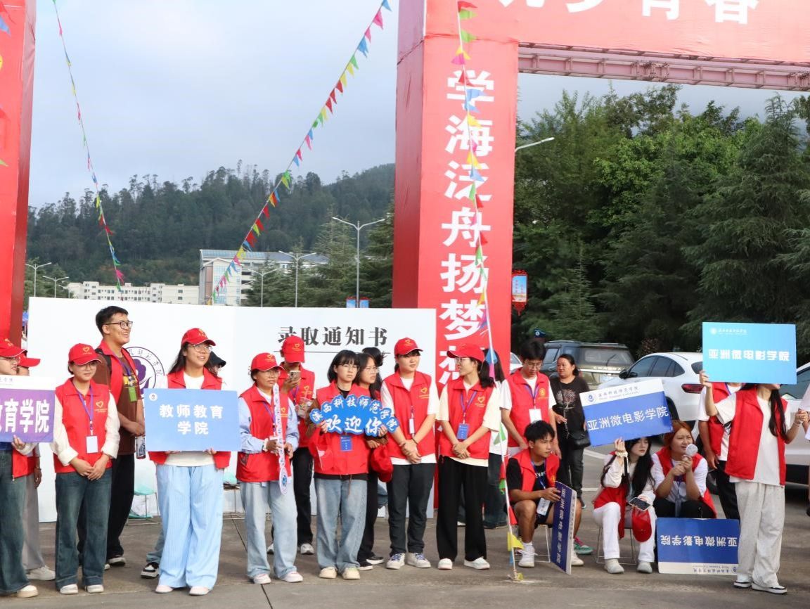 在校园的每一处角落,无论是大道旁还是小径边,都能看到“今秋将青春存入滇院 未来收获那经纶年华”“青春由磨砺而出彩 人生因奋斗而升华”等宣传标语;报到点还设立了“我爱滇院”落地立体字和“录取通知书”打卡点,尚行路的红旗在风中舞动,让迎新的氛围愈发浓厚。
