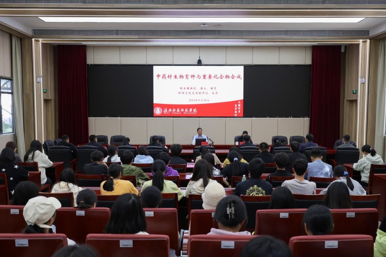 杨生超以幽默风趣的语言开场,称自己是“药童”,理想是做一个“牧马人”,并展示了《狗的进化:人狗情未了》《AIDa阿依达公主:我的身材我做主》和《一步千年:从头驯化异源四倍体野生稻》等研究成果,深入剖析了中药材生产模式面临的挑战,介绍了三七抗病成果和人参皂苷等项目,让师生们对中药材领域的前沿研究有了深入了解。杨生超强调科学研究需要坚定的决心与无畏的勇气,激励师生在科研道路上勇往直前。