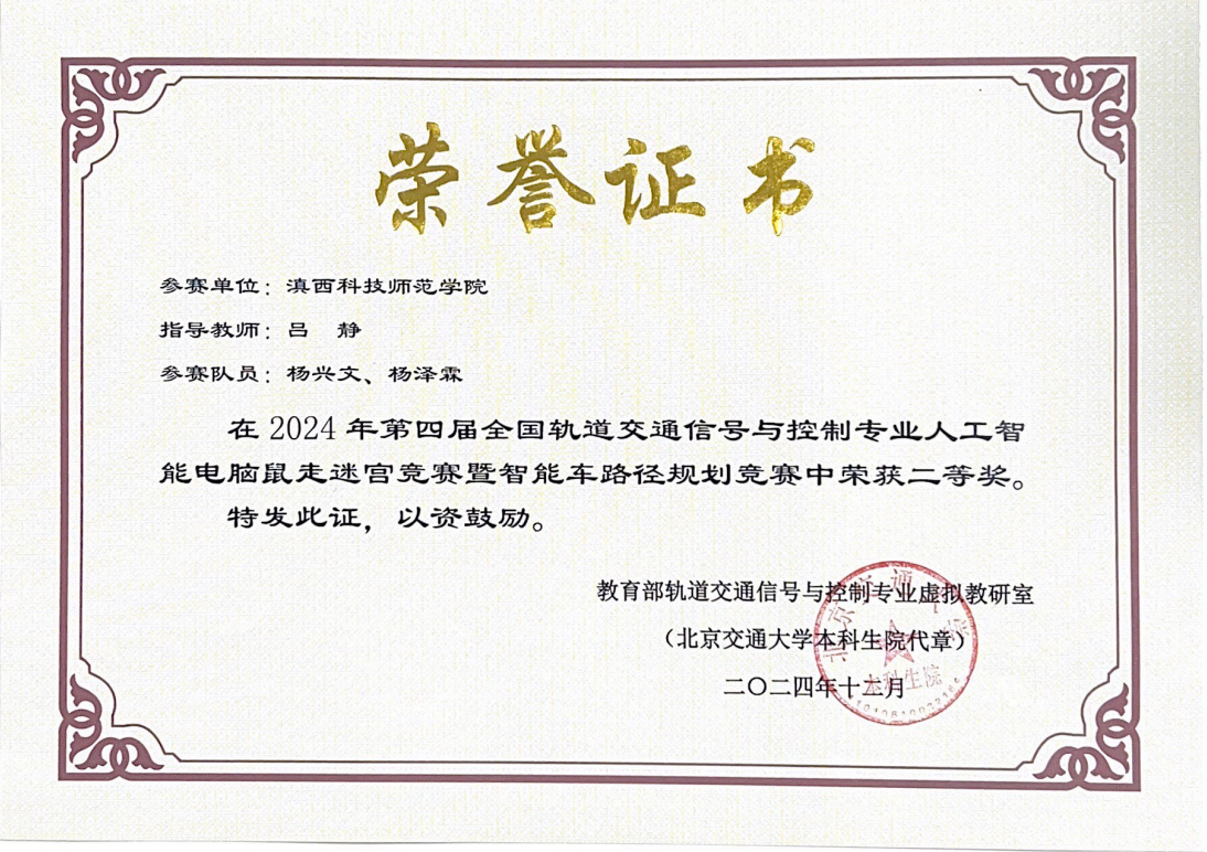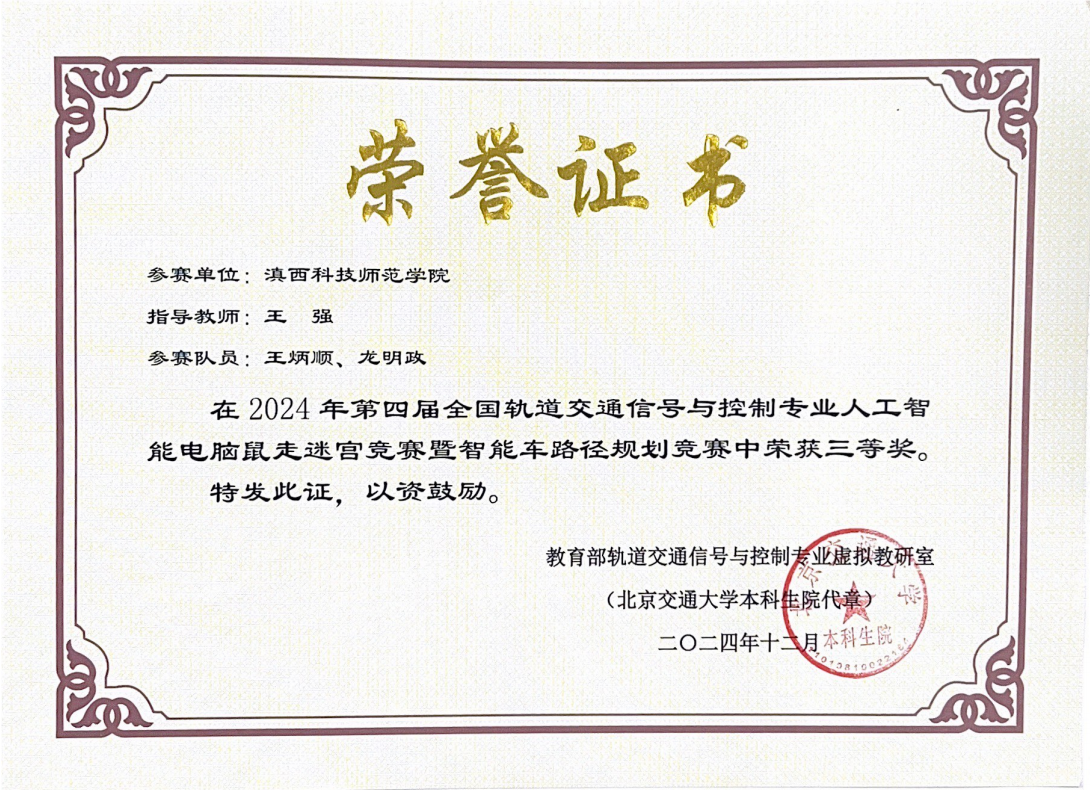 近日,由教育部轨道交通信号与控制专业虚拟教研室主办、北京交通大学承办的第四届全国轨道交通信号与控制专业人工智能电脑鼠走迷宫线上竞赛落幕。我校信息学院2021级智能科学与技术一班杨兴文、杨泽霖同学荣获全国二等奖;智能与控制学院2022级机器人工程班王炳顺、龙明政同学荣获全国三等奖。