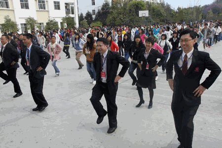 云南财经大学校长熊术新(前左一)兴高采烈地参与学校民族舞课间操