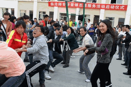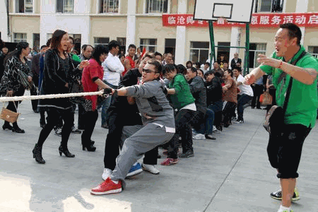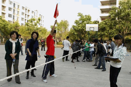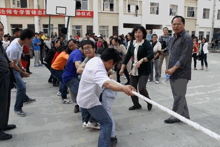 比赛现场竞争激烈,各队据理力争,谁都不甘示弱。绳正中的铃铛忽左忽右,绳两头的队员们面红耳赤、咬牙鼓腮。庞大的啦啦队伍也不等闲,神情专注紧张,吼破嗓子,手舞足蹈,恨不能把自己身上的力气能传导给参赛队伍。行政一队和艺体系代表队的巅峰对决尤为精彩,两队队员们使劲的表情最为夸张,是拉锯时间最久的比赛。行政一队终以必胜的信念、团结的坚持荣登冠军宝座。