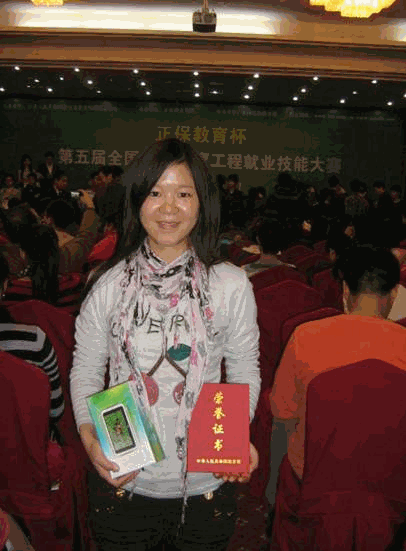 12月8日,在北京金辉国际大酒店三楼会议厅举行了隆重的颁奖典礼,杨芳同学作为获得一等奖的选手之一,接受了教育部教育管理信息中心于广明副主任的颁奖。中国高等教育学会会长,原教育部副部长周远清、教育部教育信息中心主任咸立亭、教育部教育信息中心开发处处长薛玉梅、清华大学侯炳辉教授等教育部领导、专家到会并作重要讲话。