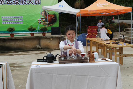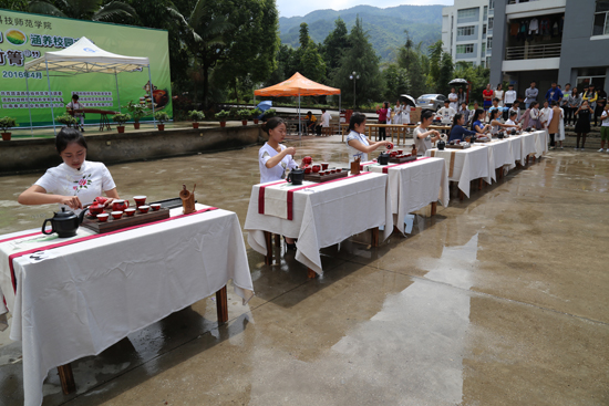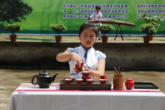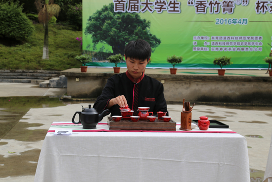 (党委宣传部 张玉超)4月25日下午,以“品味中华茶韵、涵养校园文化”为主题,滇西科技师范学院首届大学生茶艺技能大赛在校园进行,该比赛是结合云南省高校工委大学生文化节的相关要求,由农学系和团委共同举办。经过初赛,40名同学进入决赛,除先期已举行的茶文化知识竞赛外,决赛内容还包括茶席设计和茶艺表演(指定红茶或普洱茶)。