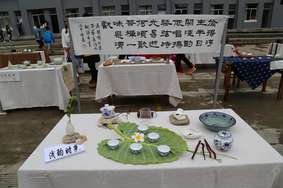 同学们多从大自然拾回素材,一片芭蕉叶、竹叶或是荷叶,一枝艳丽的三角梅或是绿意盎然的柳条,一个松果或是石头,亦或是一截木桩……通过同学们的巧思妙手,成就一个个取名“茶暖花开”、“绿竹含新粉”、“喜结良缘”、“浅酌时光”、“蕉下留客”、“青春味道”、“君子之交”等颇具诗情画意的茶席,行走其间,犹如在诗里、画里,心境顿时清、雅。