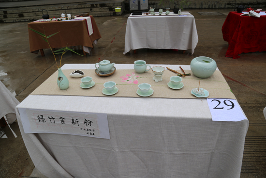 茶艺表演前茶席布置就绪,供来往的师生驻足观赏和评委鉴评。茶席设计中最基本的构成因素有茶品、茶具,铺垫、插花、焚香、挂画、背景、音乐等相关工艺品、。一个成功的茶席设计,要主题鲜明,选择的茶叶同茶具适宜,相关工艺品运用得当、能充分表现茶席主题,兼具实用性和艺术性。