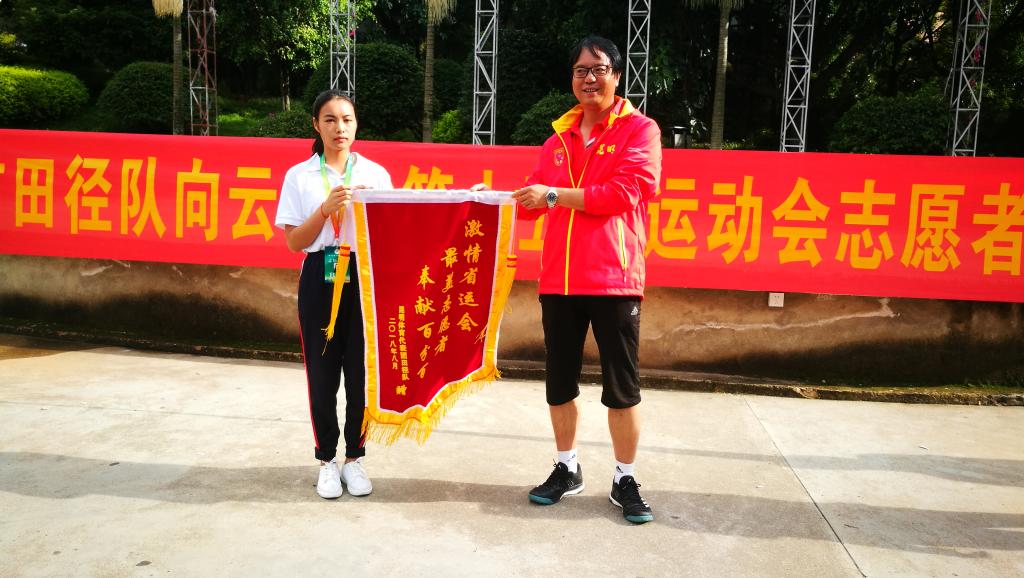 8月17日,为了感谢滇西科技师范学院全体志愿者们的热心服务,昆明市田径队在我校舞台球场为志愿者们赠送锦旗。