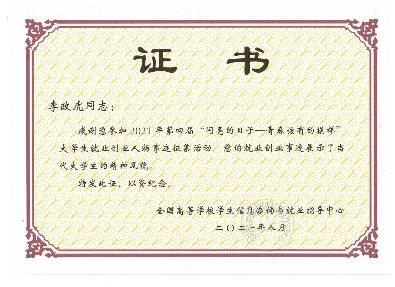 近日,在全国高等学校学生信息咨询与就业指导中心组织开展的2021年第四届“闪亮的日子——青春该有的模样”大学生就业创业人物事迹征集活动中,我校2021届毕业生李政虎的创业事迹成功入选。