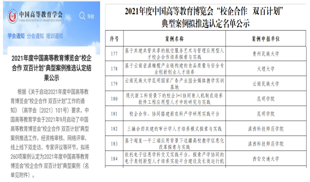 为全面落实《国务院办公厅关于深化产教融合的若干意见》(国办发〔2017〕95号)精神,深化产教融合、校企合作,促进教育链、人才链与产业链、创新链有机衔接,中国高等教育学会于2021年9月启动了中国高等教育博览会“校企合作 双百计划”典型案例推选工作。经资格审核、网络评审、线上线下双走访、专家评议等环节,拟将260项案例认定为2021年度中国高等教育博览会“校企合作 双百计划”典型案例。我省共4所高校6项案列入选,其中我校《三融合四共建的审计学人才培养模式探索与实践》和《基于超星一平三端应用背景下边疆高校教学信息化改革探索与实践》入选。