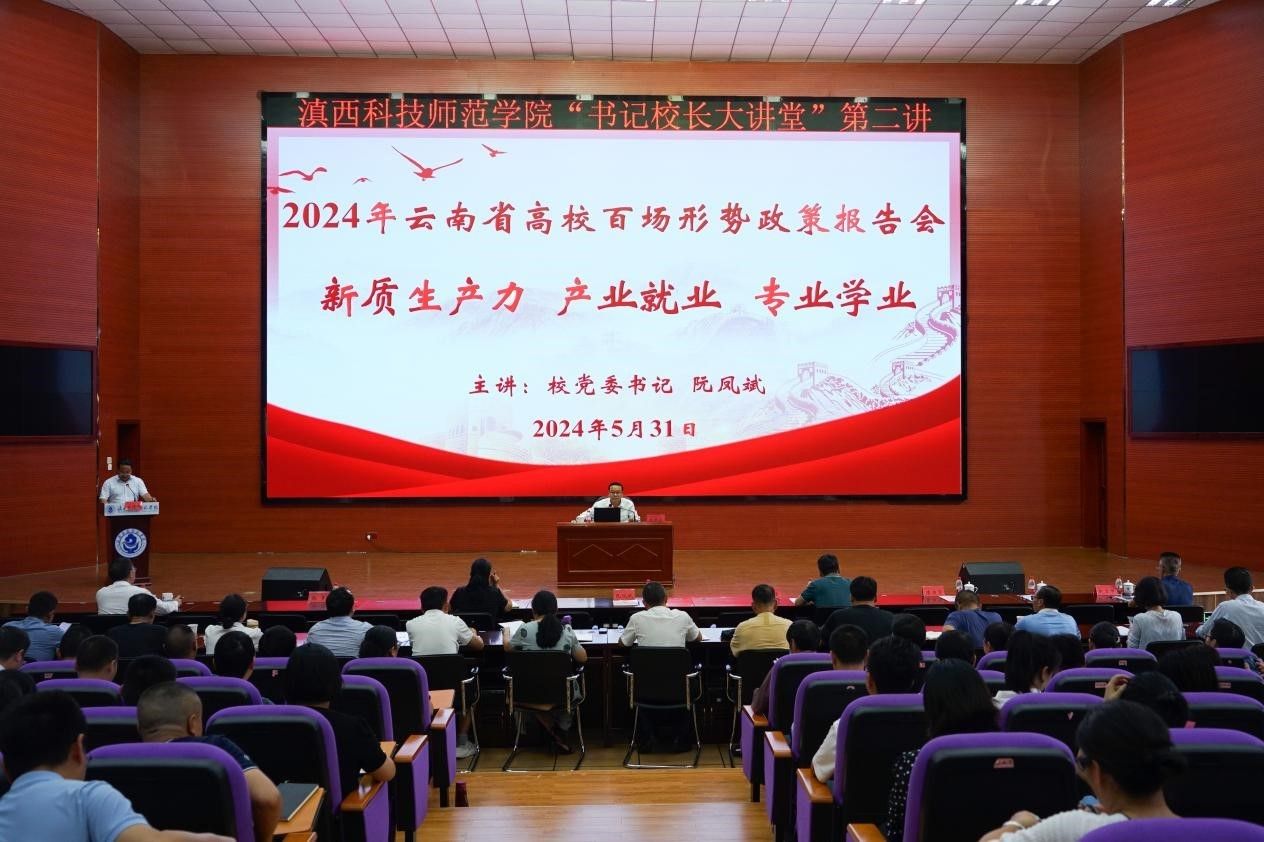 5月31日,学校举行2024年第一次形势政策报告会暨滇西科技师范学院“书记校长大讲堂”第二讲。校党委书记阮凤斌围绕“新质生产力 产业就业 专业学业”作形势政策报告,校党委副书记、校长刘艳红出席报告会。校党委副书记施勇主持报告会。
