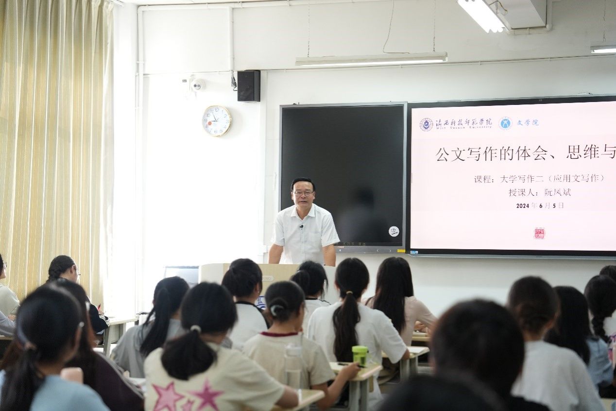 6月5日,校党委书记阮凤斌走进课堂,以“公文写作的体会、思维与方法”为题,为文学院2022级汉语言文学专业的学生讲授了一堂生动而实用的公文写作课。
