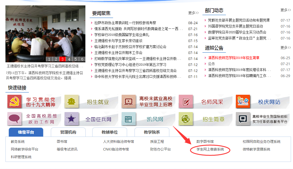 2.若无法直接打开缴费平台,请进入滇西科技师范学院官方网站http://www.wynu.edu.cn,在首页下方找到“信息平台”——“学生网上缴费系统”点击进入缴费平台。如下图:
