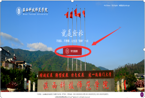 请用手机扫描二维码,关注“滇西科技师范学院财务信息平台”,关注公共号后请点击下方的“学生缴费”,登陆账号为学生的18位身份证号,初始登陆密码为身份证后6位数字。