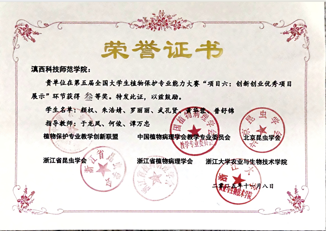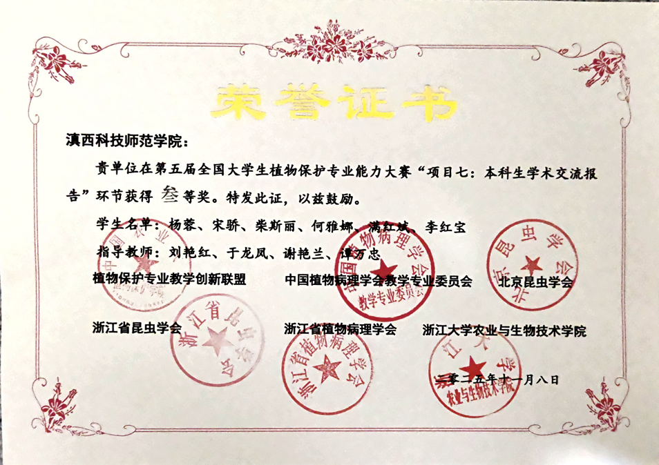 近日,第五届全国大学生植物保护专业能力大赛在浙江大学举行。我校学生团队首次参加该赛事,在大赛设置的十个单项竞赛中的“创新创业优秀项目展示”“本科生学术交流报告”两个项目中荣获三等奖2项,团体三等奖1项。