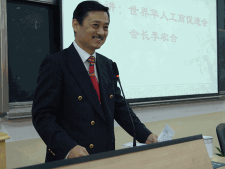 世界华人工商促进会会长李农合先生正在讲学