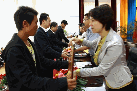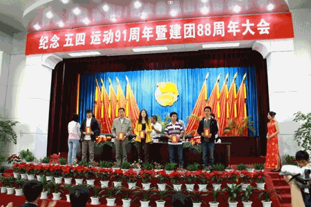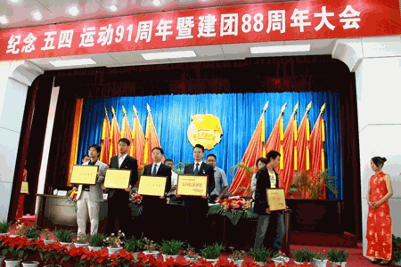 (党委宣传部 陈奇云)4月22日上午,共青团临沧市委在市委报告厅召开“纪念五四运动91周年暨建团88周年”表彰大会,临沧师范高等专科学校团委及其部分团总支和团干分别获得“五四红旗团委”、“五四红旗团总支”、“优秀团干”等荣誉称号;共青团临沧市委书记郭洪、副书记唐永飞亲自向临沧师专团委获得表彰的代表颁发了奖牌和证书。