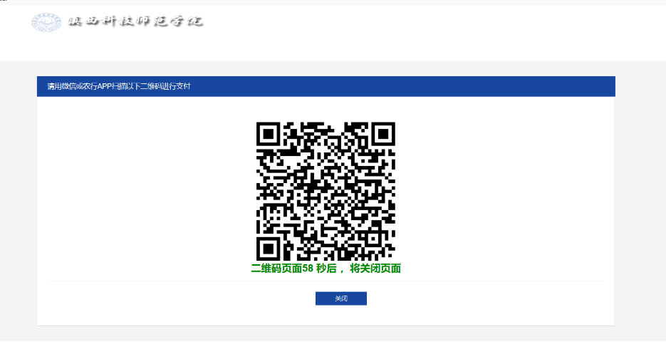 2.然后点击左侧“缴费 ”功能,会出现以下学费信息界面,根据你的应缴学费金额,输入你要实际缴纳的金额,点击“去结算”,然后选择支付方式,目前有两种扫码支付方式,一是选择中国农业银行,扫码中国农业银行二维码支付。二是选择微信,扫码微信二维码进行支付。每张二维码有效期为1分钟,超过1分钟将失效,请重新刷新后支付。