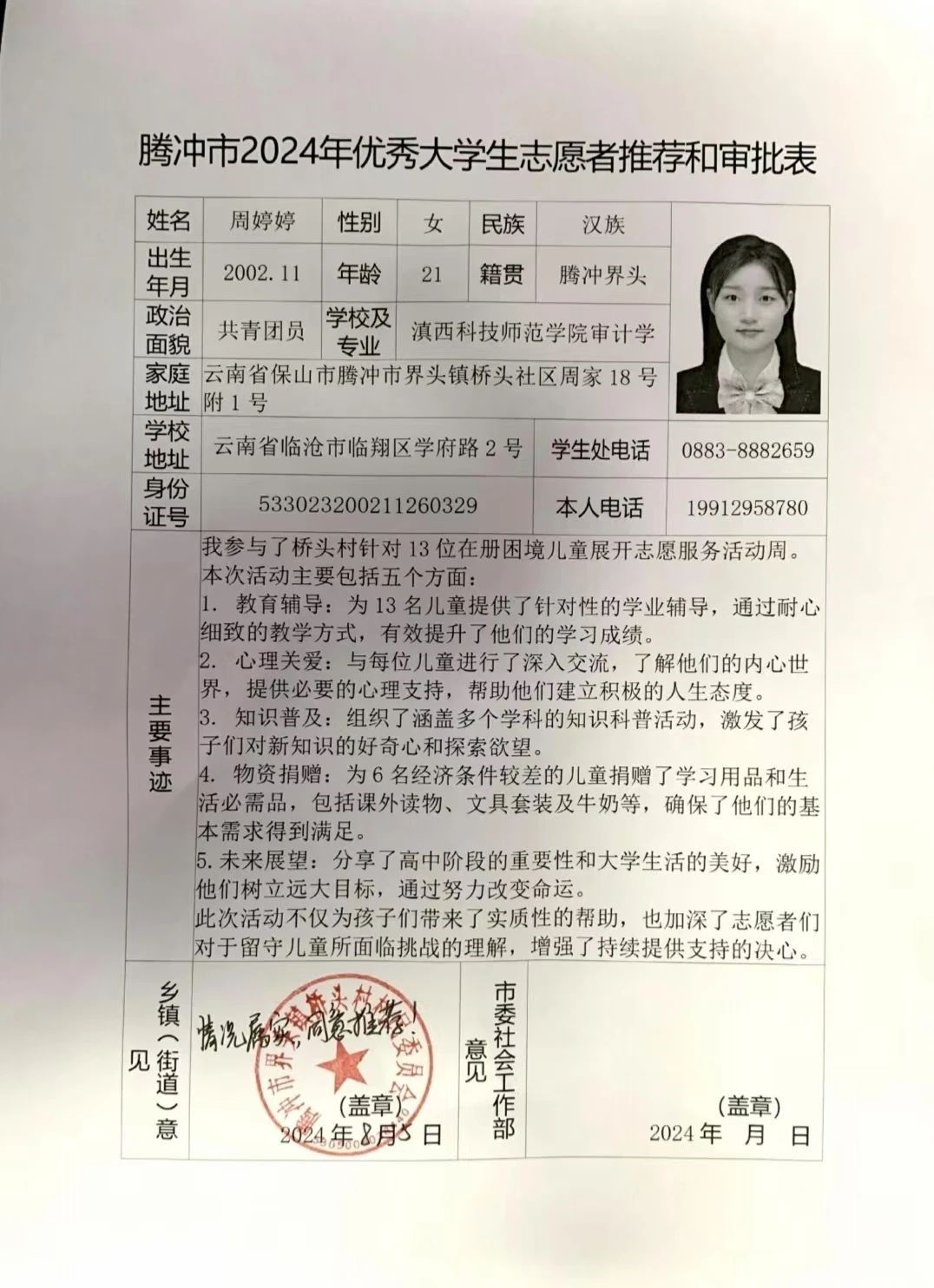 在暑假期间,周婷婷积极参与桥头村困境儿童志愿服务活动,为孩子们提供了教育辅导、心理关爱、知识普及以及未来展望等方面的服务,帮助孩子们增长了见识、提升了孩子们的心理调适能力,为孩子们树立起远大的人生目标。周婷婷表示,通过参与志愿服务活动,不仅增强了自己的社会责任感,学会了关心他人和关注社会问题,同时还提升了个人的语言表达能力,培养了团队合作精神。此次活动让她更深入地了解到留守儿童的生活现状,从而更加筑牢了关爱留守儿童的决心。她希望更多的人能够加入志愿服务队伍,贡献自己的青春力量,为建设美好社会注入自己的青春活力,对于周婷婷来说,志愿服务是一段非常有意义的经历,让她收获了成长和感动,她将继续投身志愿服务,继续践行“奉献、友爱、互助、进步”的志愿者精神,将爱与温暖传播给更多人。