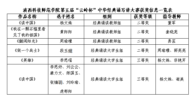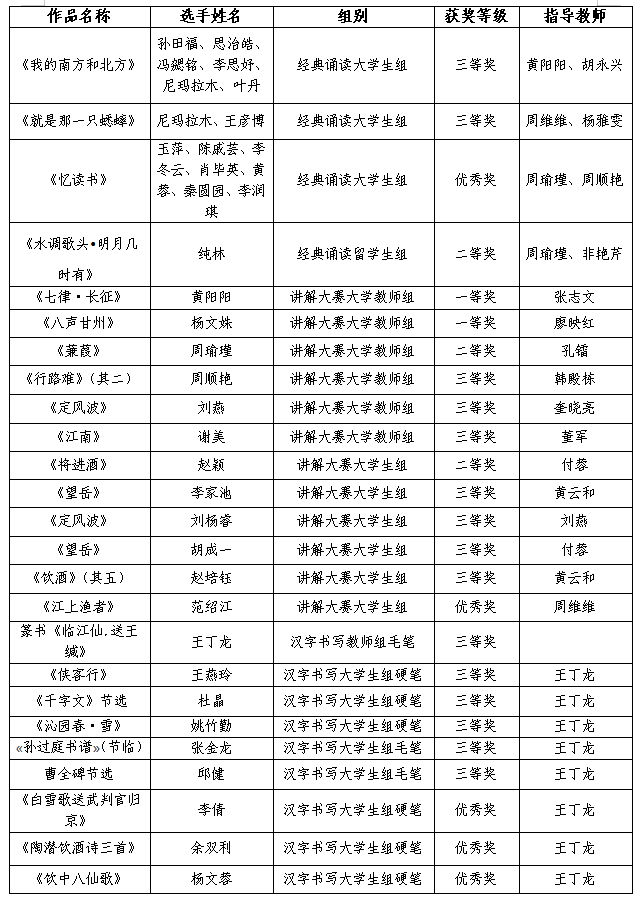 近日,云南省第五届“云岭杯”诵写讲大赛圆满落幕。我校共有31个参赛作品获奖。在“书香彩云南”经典诵读大赛单元中获教师组二等奖3项,大学生组二等奖1项、三等奖4项、优秀奖1项,留学生组二等奖1项,并进入国家级复赛;在“诗意彩云南”讲解大赛单元中获大学教师组一等奖2项、二等奖1项、三等奖3项,大学生组二等奖1项、三等奖4项、优秀奖1项,优秀指导教师奖2项;在“墨香彩云南”汉字书写大赛单元中获教师组三等奖1项,大学生组三等奖5项、优秀奖3项。学校连续四年荣获“优秀组织单位”奖。