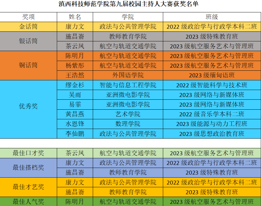 至此,学校第九届主持人大赛圆满落幕。大赛旨在挖掘与培养具有主持综合能力的优秀人才,丰富学校青年学子第二课堂校园文化生活,为学生提供自我展示的平台,传播滇院声音,展现新时代滇院青年的精神风貌。