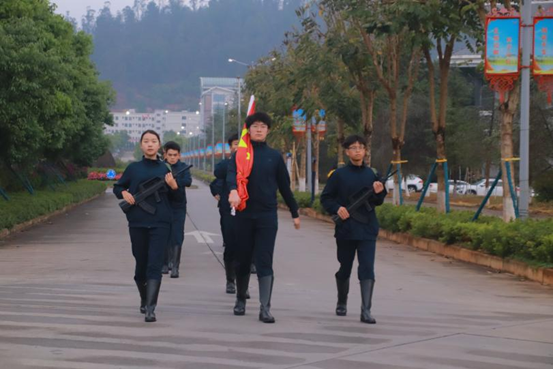 晨光初露,国旗护卫队迈着整齐有力的步伐护送国旗走向升旗台,随着激昂的《义勇军进行曲》,五星红旗冉冉升起,全体师生庄严肃立,面向国旗行注目礼。