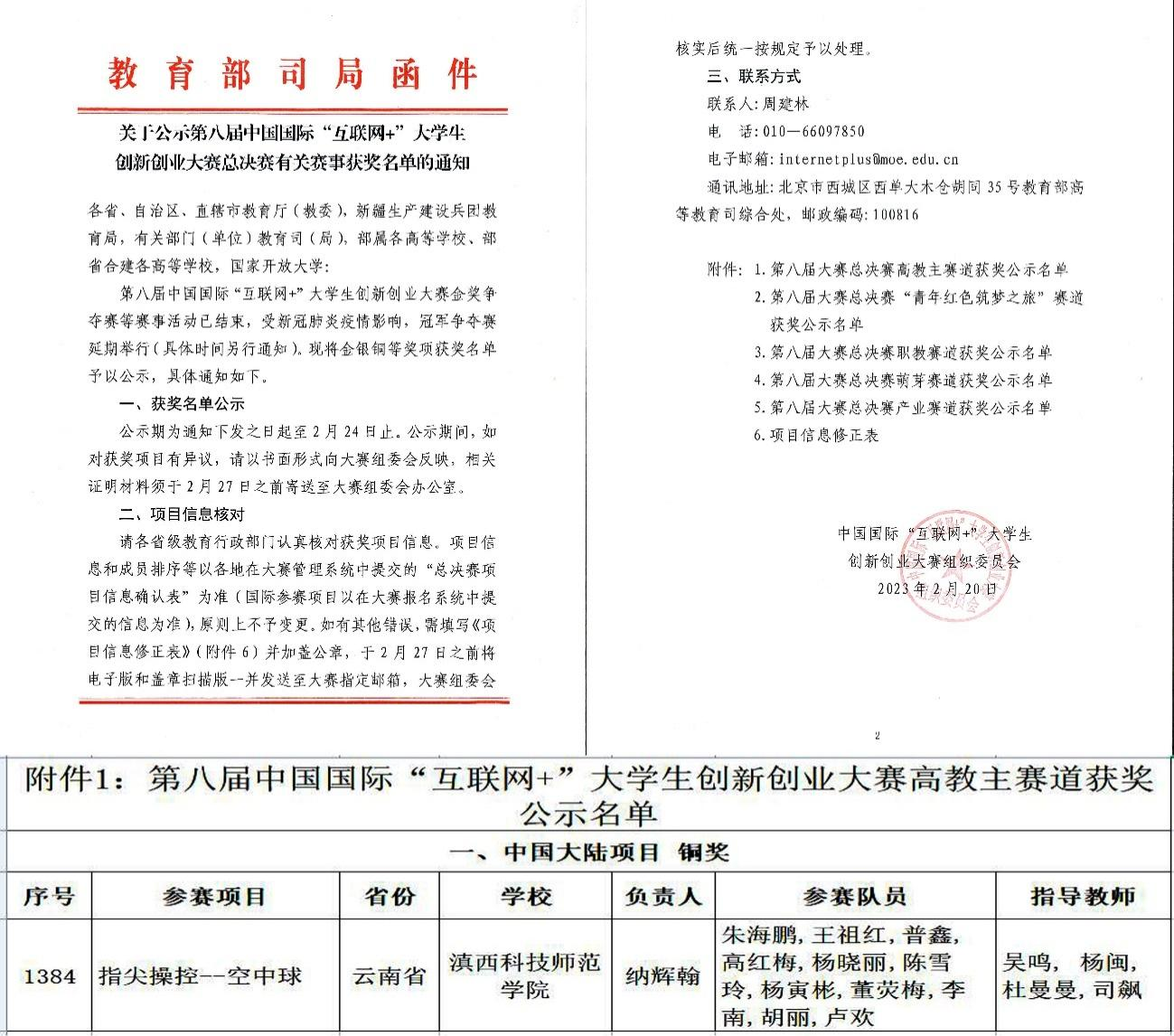 智能与信息工程学院在应用型人才培养和专业建设发展方面,始终高度重视学科专业技能大赛和创新创业大赛发挥的作用,始终坚持“以赛促教、以赛促学、以赛促创”的宗旨。“指尖操控-空中球”参赛团队师生克服重重困难,通过实际行动,生动诠释了青年一代“我敢闯,我会创”的精神和扎根云岭大地服务区域发展的担当。下一步,我院将继续通过以赛促教、以赛促学和以赛促创,激发学生创新创业热情,促进学科专业发展及“产-学-研”持续转化,推动学院高质量转型发展。