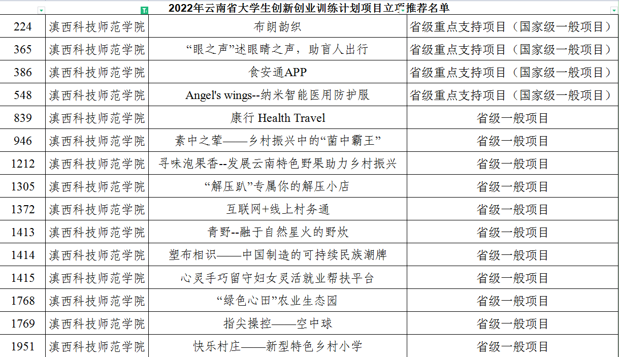 7月8日,学校推荐的15个创新创业项目获2022年云南省大学生创新创业训练计划项目立项。其中,“布朗韵织”“眼之声”“食安通APP”“纳米智能医用防护服”4个项目立项为省级重点支持项目并参与国家级项目角逐;“素中之荤”“寻味泡果香”“解压趴”等11个项目立项省级一般项目。